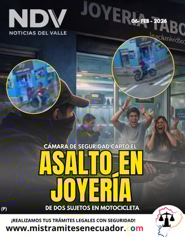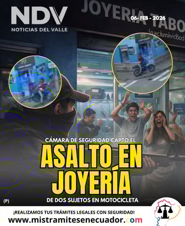 Sangolquí volvió a ser escenario de un hecho violento a plena luz del día. Este jueves 6 de febrero de 2026, una joyería ubicada en la intersección de las calles Montúfar y Leopoldo Mercado, en pleno centro de la ciudad, fue asaltada por dos sujetos armados que se movilizaban en una motocicleta.